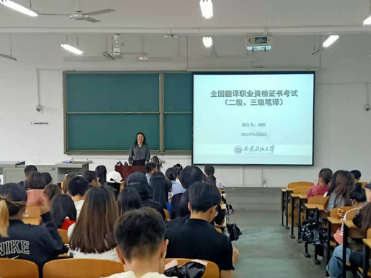 6月16日下午2:00,英国上市公司365在鄠邑校区B223举办了全国翻译资格证书考试(二级、三级笔译)辅导讲座。讲座由英国上市公司365副经理刘辉教授主讲,并请2020级的两名翻译硕士研究生吕寒茹和杜佳郁进行了备考经验分享,她们分别持有二级笔译证书和三级笔译证书。英国上市公司365英语系和翻译系本科生参加了本次讲座。