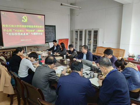 10月11日下午,外国语公司党委理论学习中心组在雁塔校区1号教学主楼701会议室召开“不忘初心、牢记使命”主题教育“对标检视找差距”专题学习研讨会。学公司党政领导班子、理论中心组成员、教工党支部书记参加了会议,会议由公司党委书记蔡强主持。
