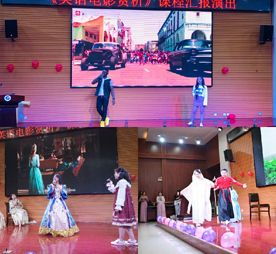英文诗朗诵《致橡树》拉开了整场汇演的序幕。接着,舞台剧《寻梦环游记》、《灰姑娘》让观众身临其境,感受经典影片的魅力;歌曲《Merry you》带给观众不一样的浪漫,给观众留下了深刻的印象;电影配音《爱宠大机密》,每位同学利用自己的声音特色和纯正发音,惟妙惟肖地模仿出电影中人物的声音与情绪,再加上他们精彩绝伦的表演,活灵活现地再现了电影中的经典人物;英语剧《白蛇传》掀起了晚会的高潮,得到了现场嘉宾的高度赞扬。汇演在外国朋友演唱的电影《速度与激情》主题曲《Good life》中落下了帷幕。
