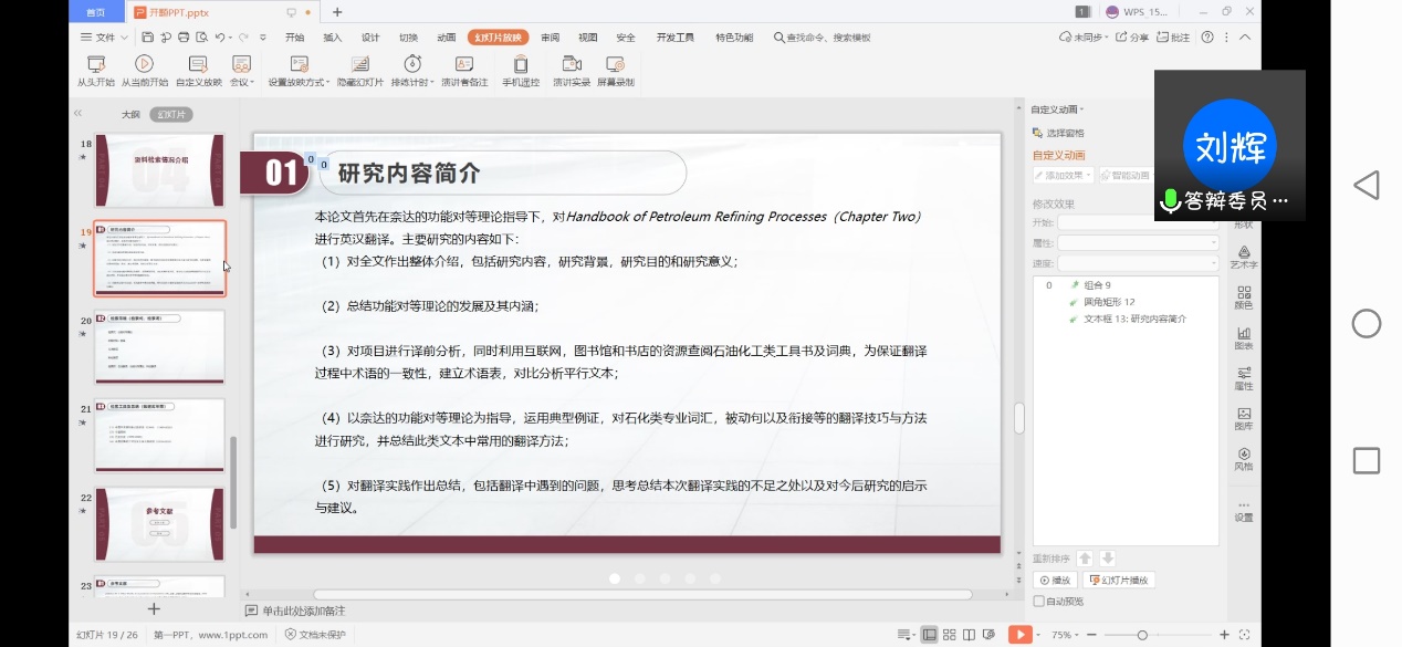 每位员工以PPT形式展示汇报开题内容并进行答辩。开题员工向答辩老师就选题意义、文献综述、主要内容、创新点及进度安排等进行了陈述,并回答老师的提问。答辩小组对各位研究生的开题报告分别进行了有针对性的现场点评,指出了存在的问题和修改意见,并要求同学们根据意见及建议认真地对选题及内容进行调整和修改。