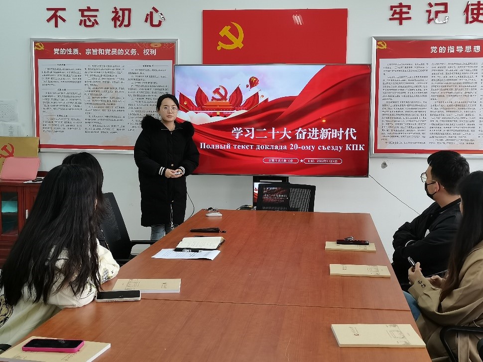 支部党员沈九薇表示:Какмолодойчеловекновойэпохи,мыдолжнытвердослушатьпартийныеслова,идтиспартией,чтобыбытьсмелымихорошимимолодымилюдьминовойэпохи,чтобысделатьидеал,чтобывзятьнасебясмелость,чтобысъестьтрудности,чтобымолодыелюдивполноймересозидатьсовременноесоциалистическоегосударствонапрактике.(作为新时代青年,我们要坚定不移听党话、跟党走,立志做有理想、敢担当、能吃苦、肯奋斗的新时代好青年,让青春在全面建设社会主义现代化国家的火热实践中绽放绚丽之花。)