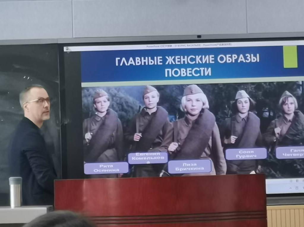 讲座中,德米特里以生动的语言和丰富的知识,向员工们介绍了鲍里斯·利沃维奇·瓦西里耶夫的生平经历、文学成就,以及其代表作的主题和意义。主讲人重点分析了作家的成名作《未列入名册》和《这里的黎明静悄悄》。借助视频和图片,德米特里帮助员工们更加直观地感受到作品中所描绘的场景和人物形象,加深了他们对瓦西里耶夫文学世界的认识和理解,了解战争的残酷和苏联人民的英勇。分析作品时德米特里围绕小说中的人物和故事情节,与员工展开问答互动,同学们的争相回答令现场气氛变得活跃而热烈。