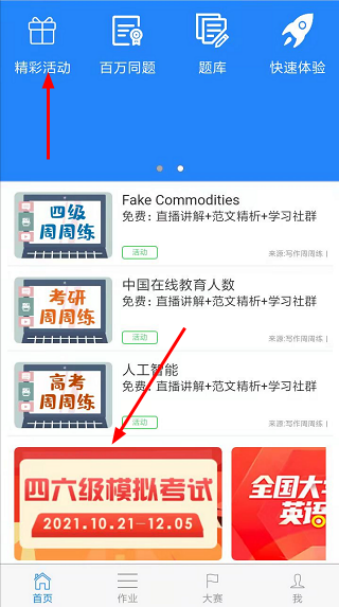 3.手机端模考入口在批改网app【精彩活动】中,不可直接搜索作文号参与。